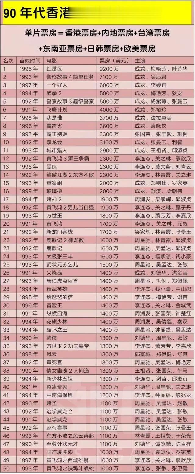 有票吧的网友就统计过九十年代的港片票房前五十名,其中周星驰五部电影共收约7100万美金,成龙两部共收8100万美金!